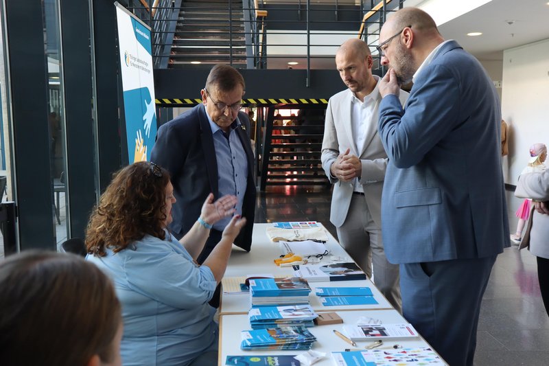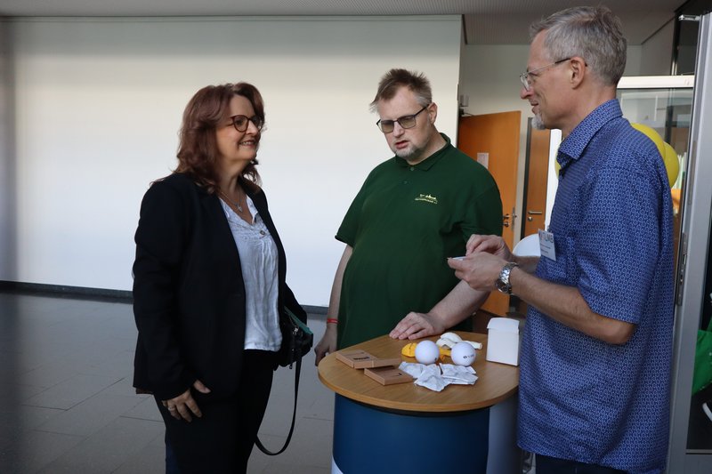 Birgit Tscherner, Arbeitsgemeinschaft der Schwerbehindertenvertretungen in Thüringen (AGSV) und Jens Elschner, Landesverband der Hörgeschädigten Thüringen e.V., unterstützten die Beratungsgespräche mit ihrem Praxiswissen und verstärkten das Standteam im Foyer. Beide sind stimmberechtigte Mitglieder im Landesbehindertenbeirat. Besten Dank für diesen Einsatz!
